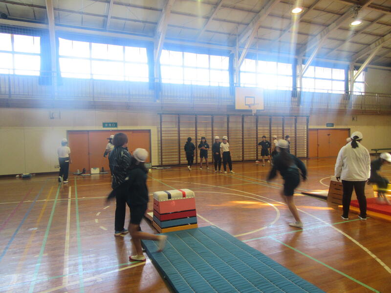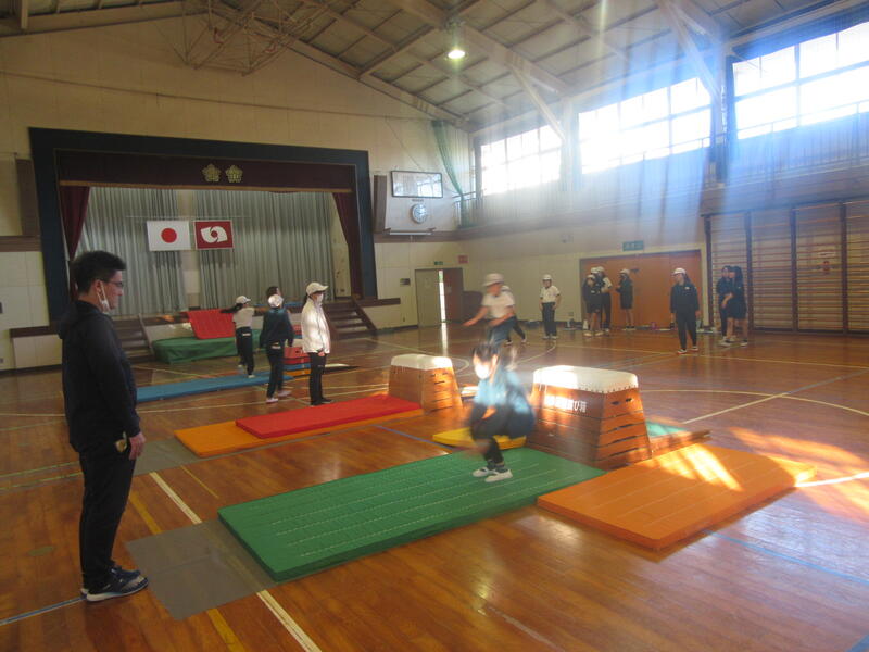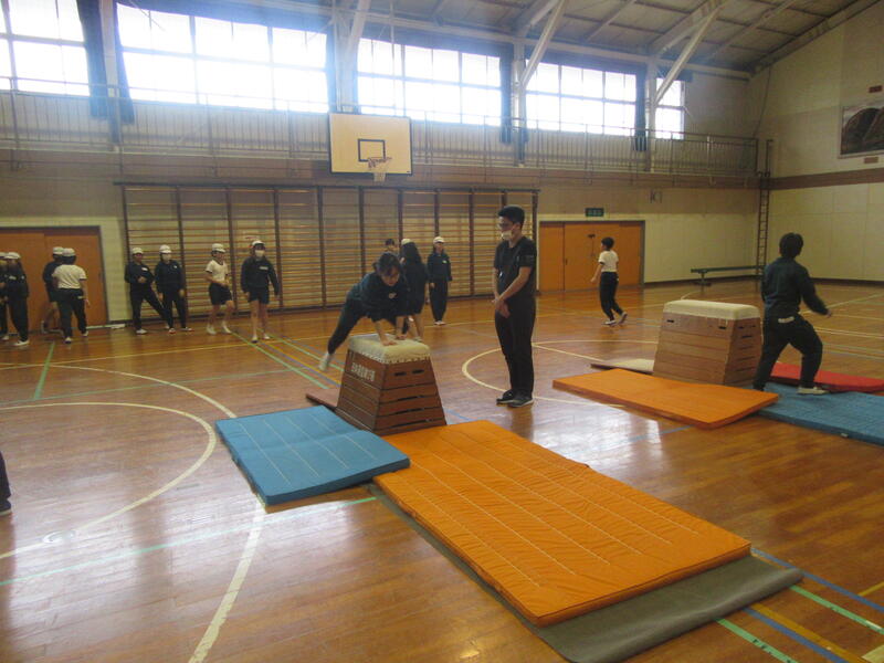 本日は「台上前転」という跳び箱の上で前転を行う高度な技に挑戦していきます。中学校の先生は挑戦するための動きを分けて丁寧に指導してくださいました。