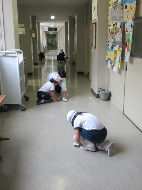 来週、1年間に一度の廊下のワックスがけを行います。今週はその前に、全校生で廊下の汚れを落としています。