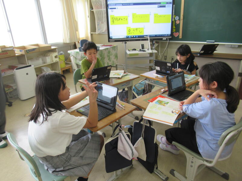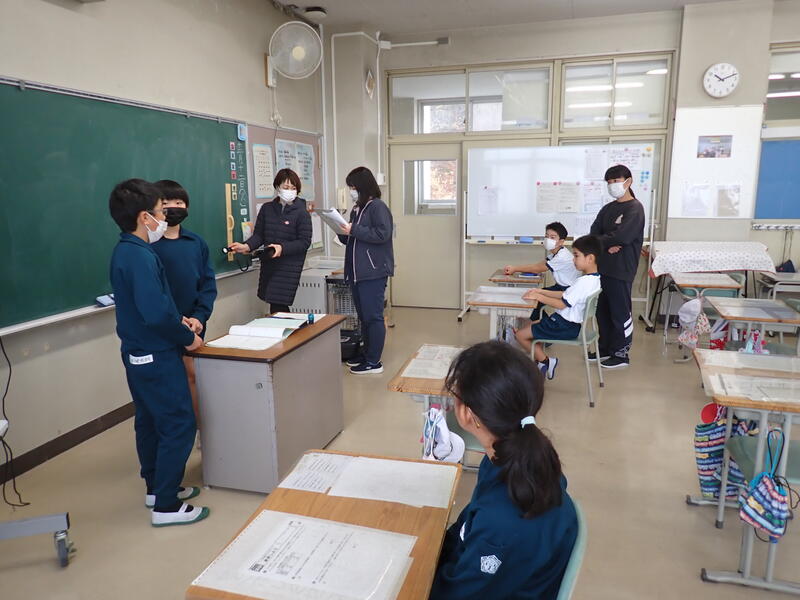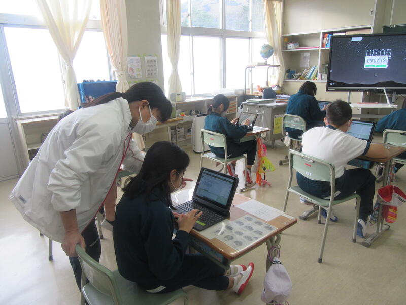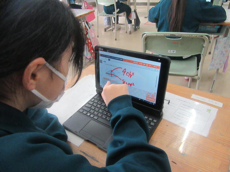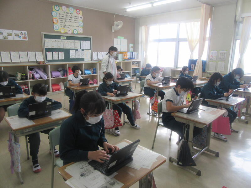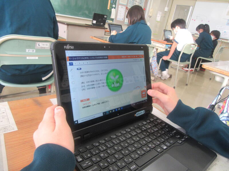 5年生はあさくすで学習端末を使った学習に取り組んでいました。まず、先生から出された課題に取り組みました。途中で式を書き込んだり、選択肢を選んだりしていました。課題が終わった子は自分で次の課題を選んで学習していました。「個別最適化された学び」と言われている通り、個々の実力や進度に合わせてそれぞれが学習しています。