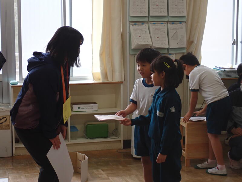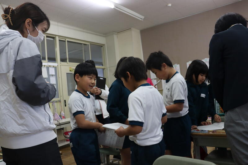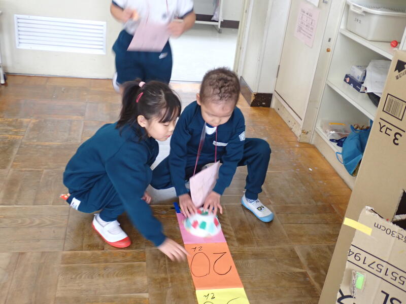 いよいよ、おもちゃ遊びのスタートです。2年生はおもちゃで遊んでくれた1年生にたくさんのプレゼントを用意していました。「50点ならこのプレゼントです~!」2年生はおもちゃ屋さんの店員さんのようにてきぱき動いていました。1年生も何回もおもちゃ遊びをさせてもらって、プレゼント袋はパンパン!笑顔も心もマンタン!