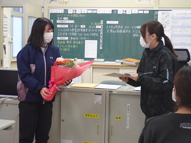 12月15日(金)より保健の古澤先生が産休に入られます。本日まで、それぞれの学年、集会等で子供たちは感謝の気持ちを述べてきました。いよいよお別れの日がやってきてしまいました。これまで古澤先生に優しくしてもらったこと、手当てしてもらったこと、悩みを聞いてもらったこと・・・を思い出し、涙を浮かべている児童がたくさんいました。