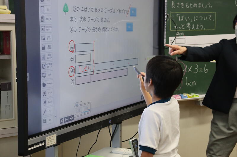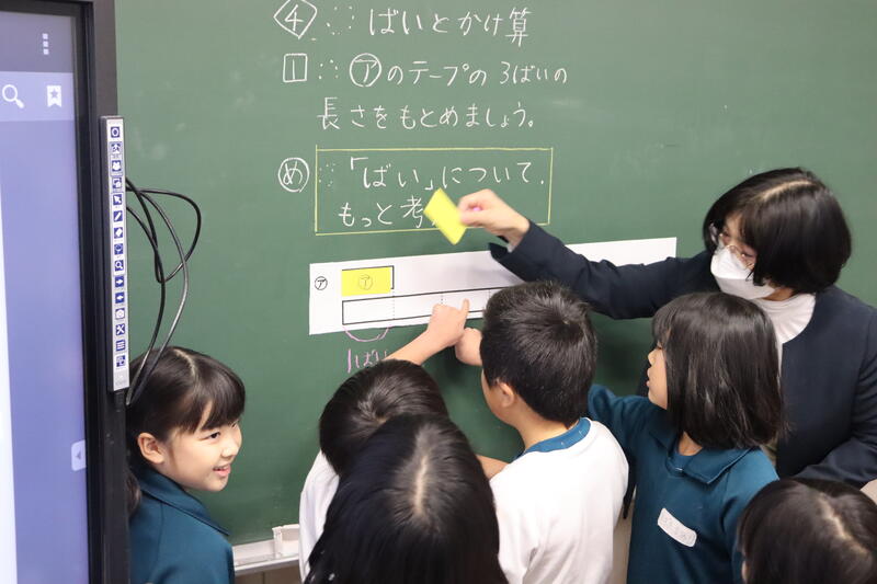 今日は「倍」について考えていくようです。テープ図を使って「もと」にする大きさのいくつ分かを考えています。自由交流では友達にも分かりやすく説明していました。「これが1つ分で、2つ分、3つ分、4つ分・・・だから4倍!」いくつ分が「倍」なのだという考えをもとに、「かけ算の式にも表せそう!」とこれまでのかけ算の学習につながっていきました。