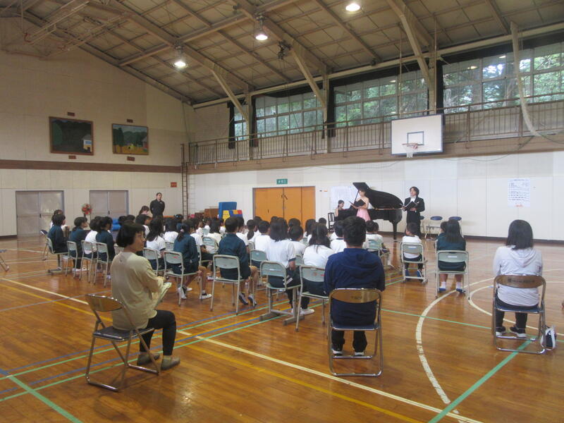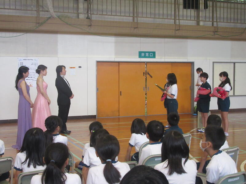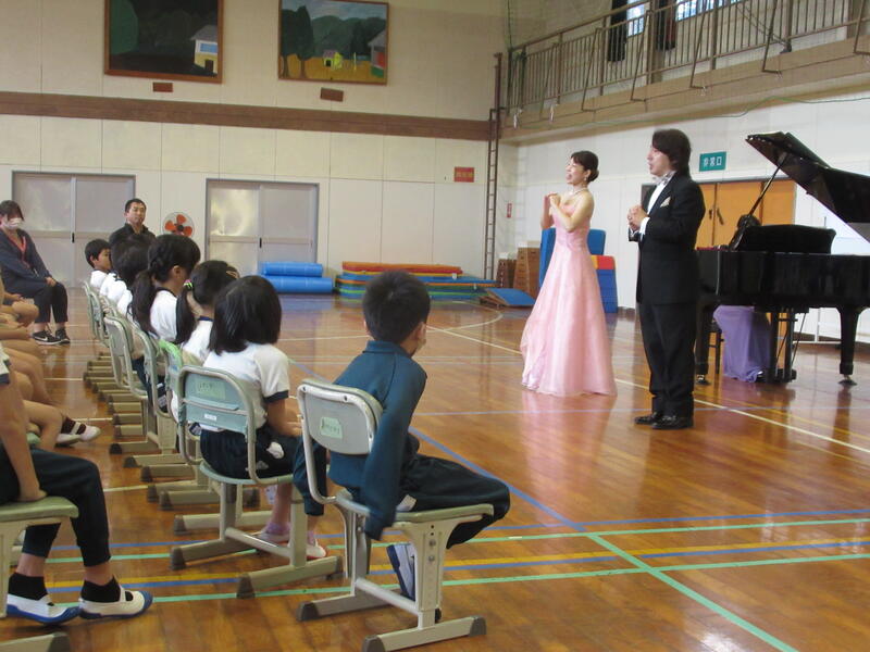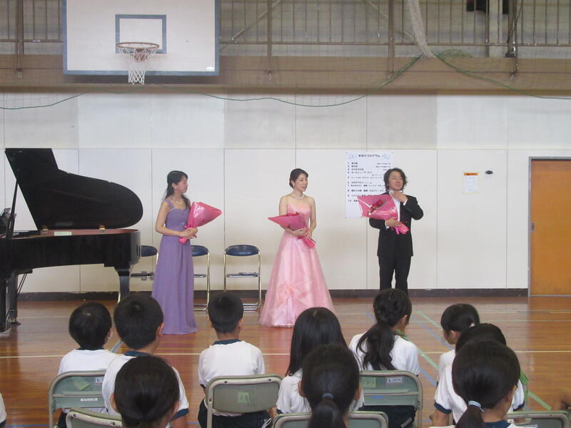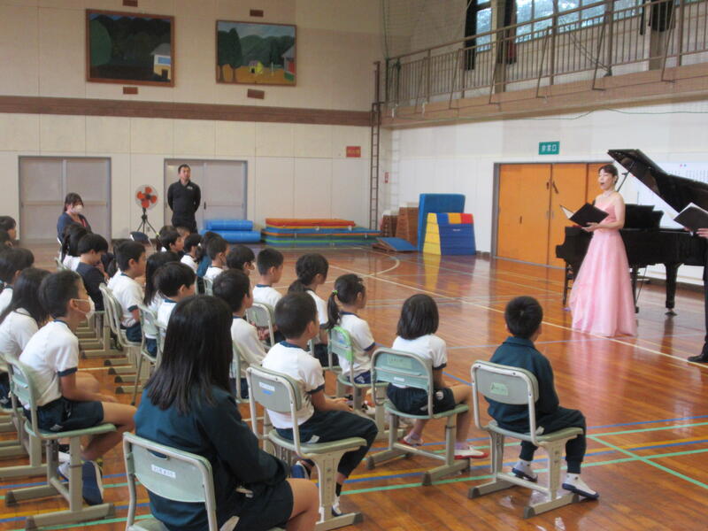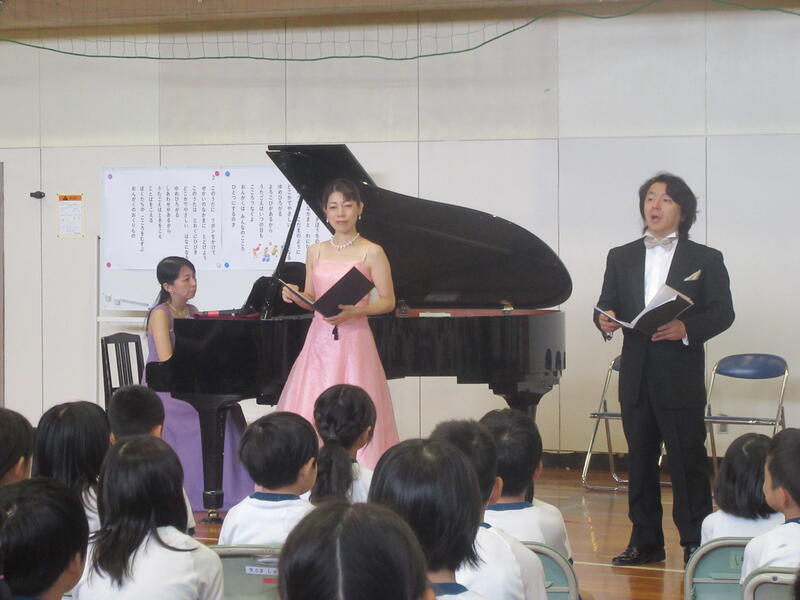 本日は3校時に体育館で鑑賞教室を行いました。今回は声楽家とピアニストの先生方をお迎えして、日本の歌や、サウンドオブミュージックのミュージカルの曲、オペラの曲などを鑑賞しました。ソプラノ、バリトン、ピアノの先生方の素敵な歌声と演奏に、子供達もいい表情で、体を動かしたりしながら歌の世界に聴き入っていました。本日の演奏プラグラムを子供達に配付しています。ご家庭でもぜひ話題にしてみてください。