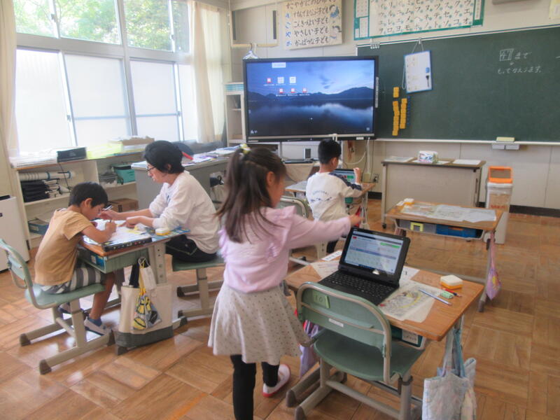 1年生は国語科で漢字の練習をしていました。タブレットを使用しながら、学習ソフトが厳しく採点してくれています。丸がつくまで何度も練習する1年生でした。