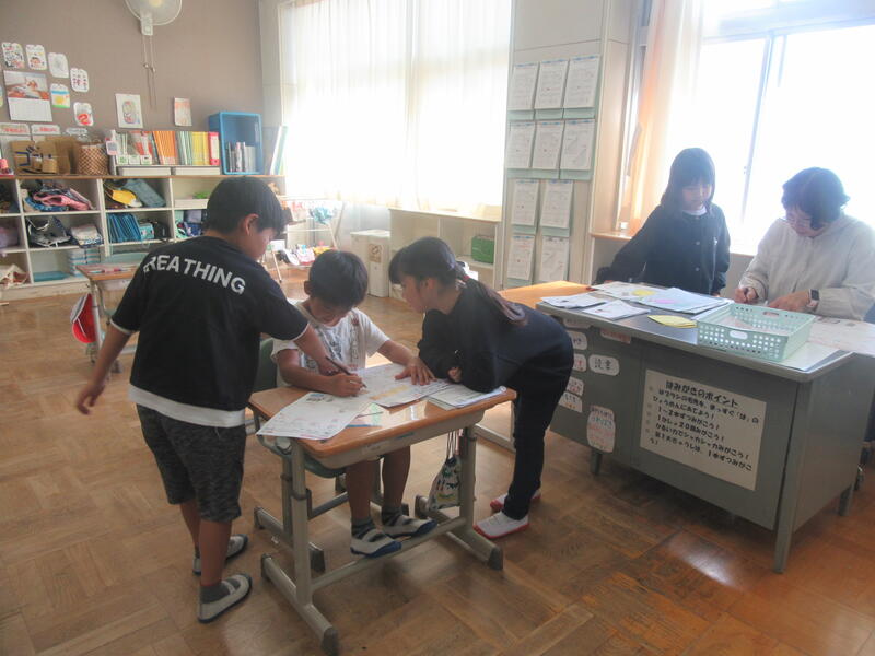 2年生は、生活科の学習で、見学学習や町探検に行ったことをグループでまとめていました。