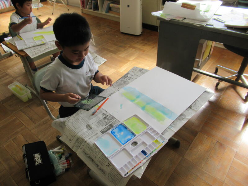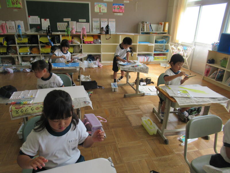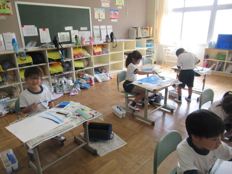 持久走が終わった後、1年生は図工で絵の具を使って絵を描いていました。絵の具を上手に使いこなしています。