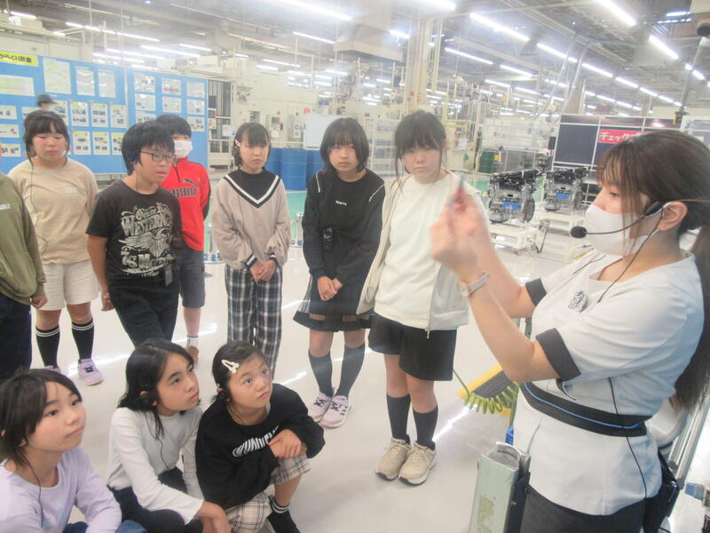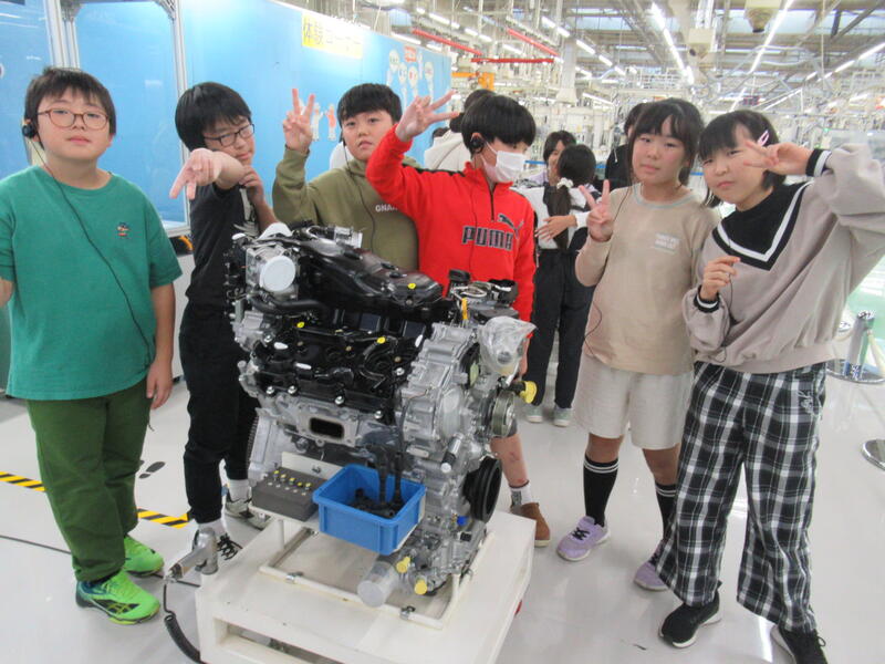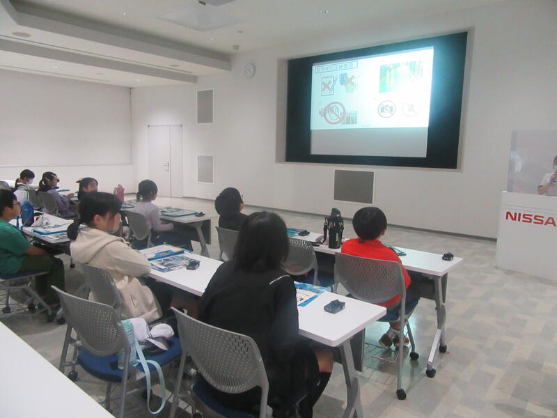 まずは日産自動車工場に着きました。動画で工場の歴史や設備の紹介がありました。5年生は社会科で学んだばかりの単元だったようで、意欲的にメモをとっていました。