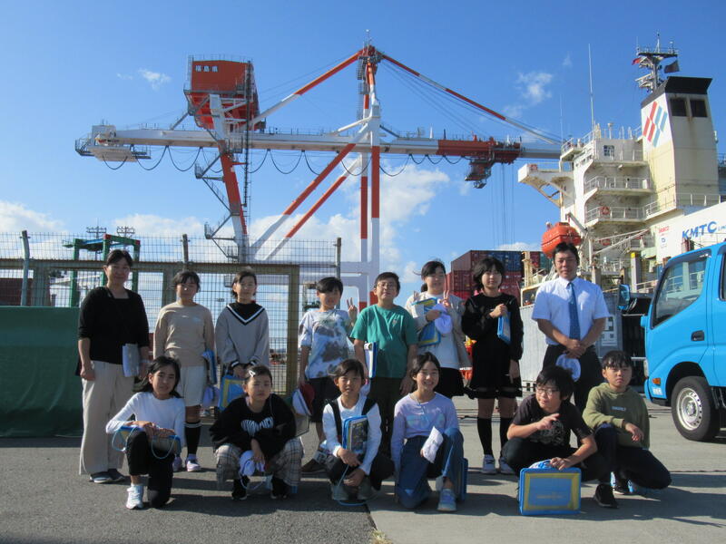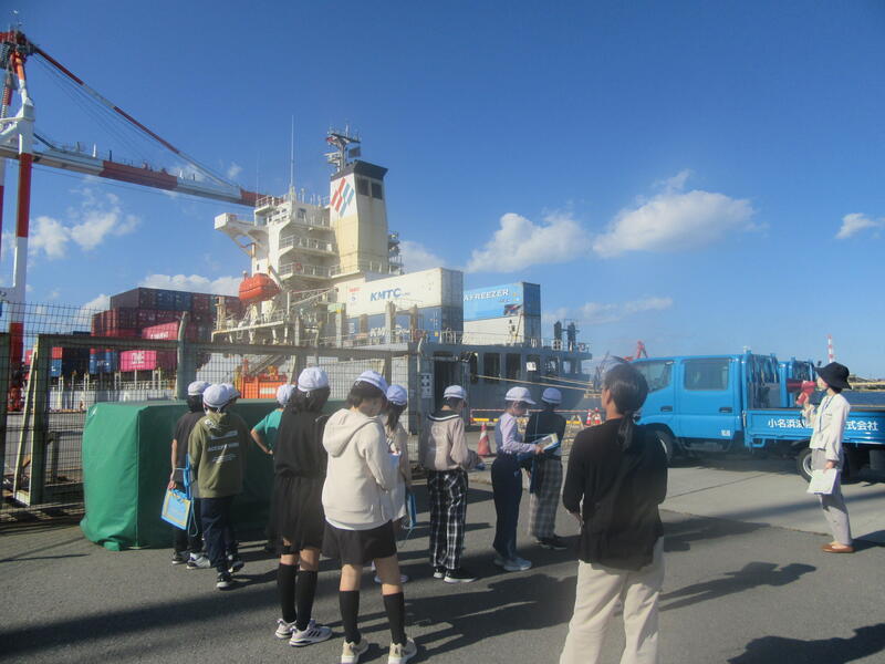 お弁当を食べてエネルギーを貯めました。いよいよ小名浜港の見学に参ります。国土交通省の職員の方々にバスに同乗してもらい、小名浜港を回ります。小名浜港には海外から石炭が多く輸送されている話を聞きました。他にも海外へ運ばれるコンテナの積み込みも見ることができました。