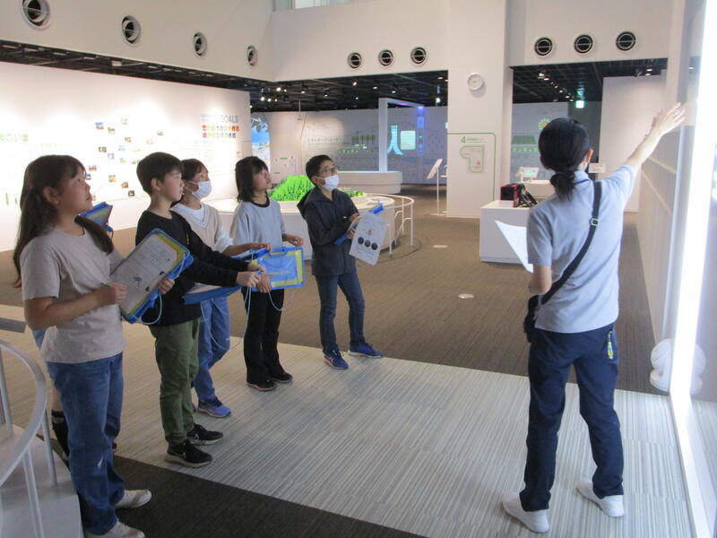 まずはコミュタン福島です。解説員の方に福島県が抱える環境問題について話をしていただきました。自分達で身近な環境を改善していこうという意欲を高めました。みんな真剣な表情で学んでいます。さすが6年生です。
