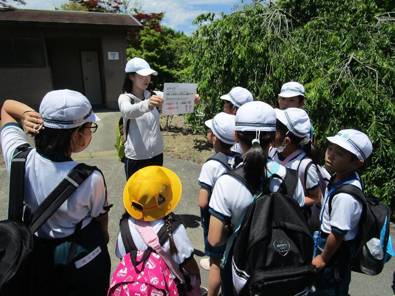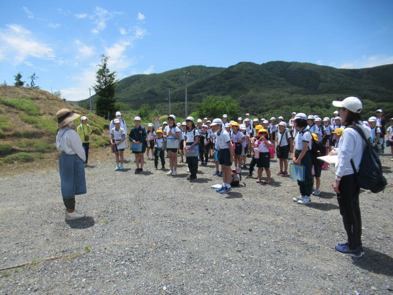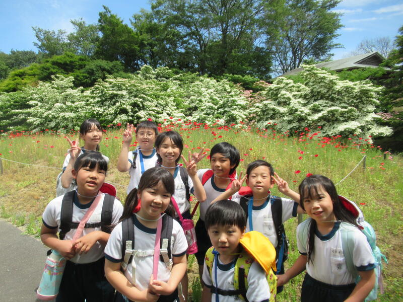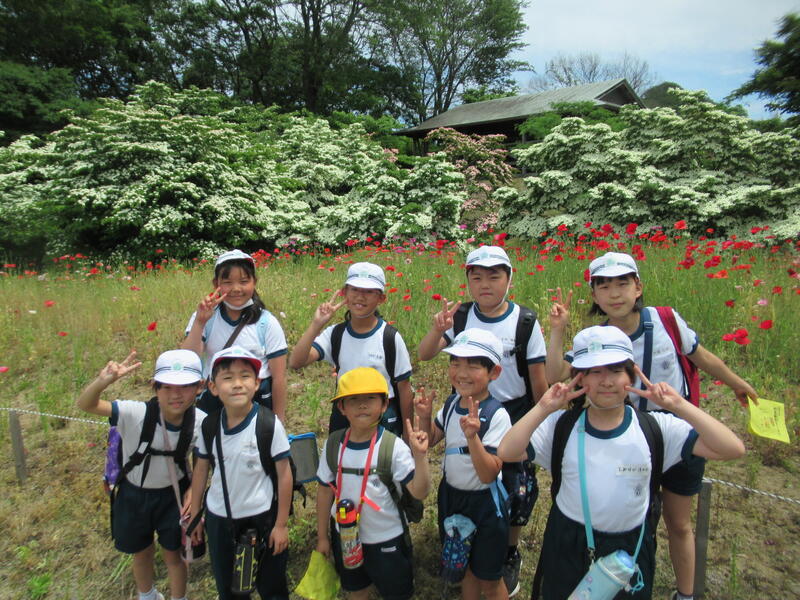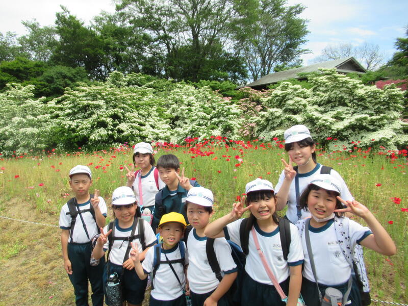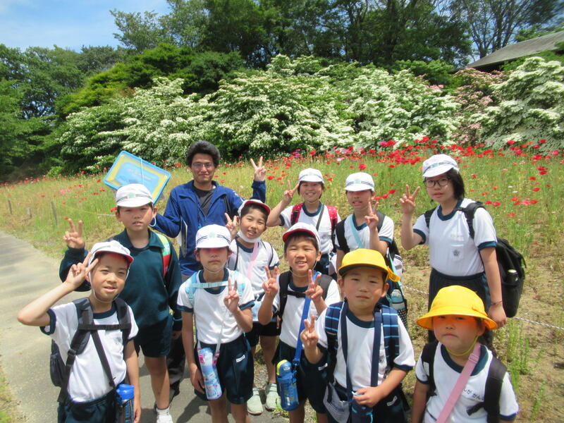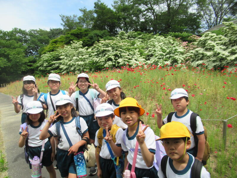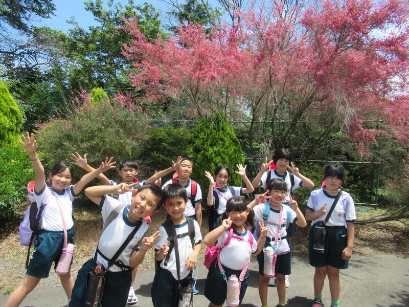 1年生の歩くペースに合わせながら、約40分かけて高野花見山公園へ着きました。まだまだ元気いっぱいの高野っ子です。「今日は1日よろしくお願いします!」