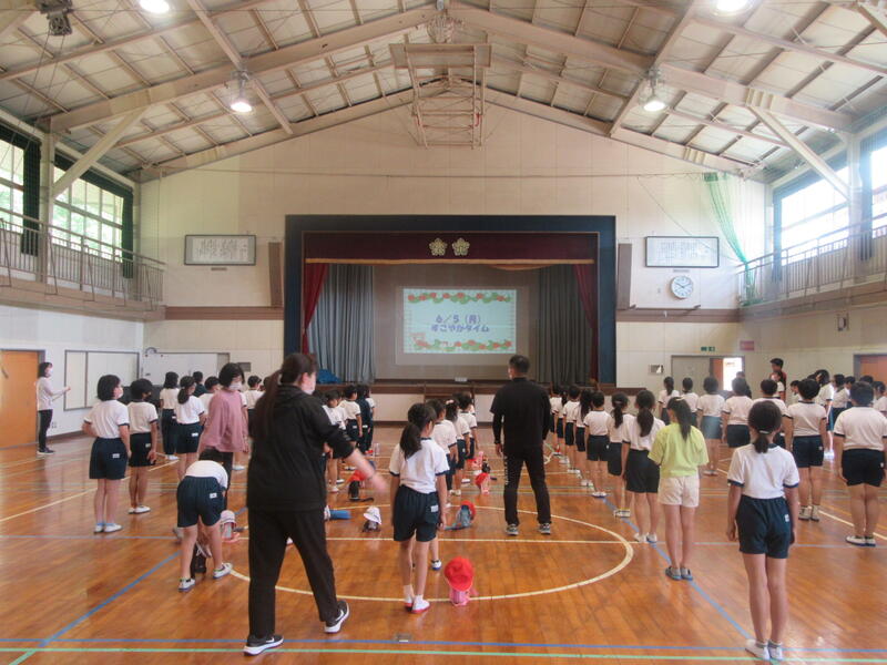 毎月一回行っている「すこやかタイム」では、全校生が一同に集い、異学年とのふれあいを通して、子供たちの豊かな心を育んでいきます。トップバッターの保健委員会の皆さん、よろしくお願いします!