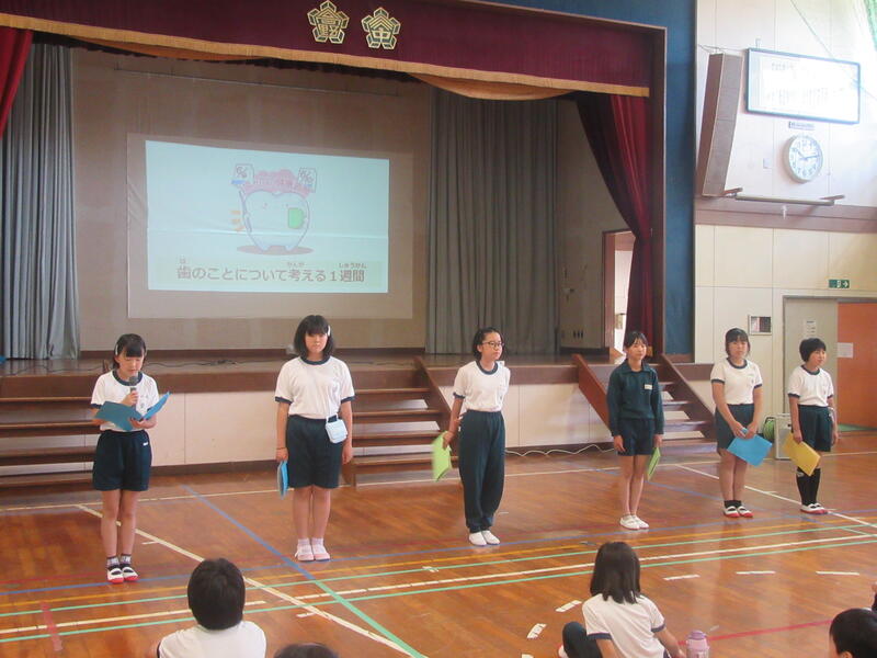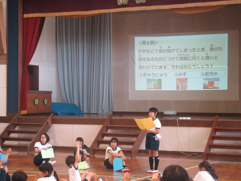 クイズと答えの解説を聞いて、驚いたり、感心したりする子供たち。何と、とても分かりやすい解説は、保健委員の皆さんが調べてまとめたものなのだそうです!体育館で練習をしてきた成果もあって、発表の仕方もみんなとても上手でした!歯を大事にしようと、みんなが改めて思った時間でした。保健委員さん、素敵な発表をありがとう!