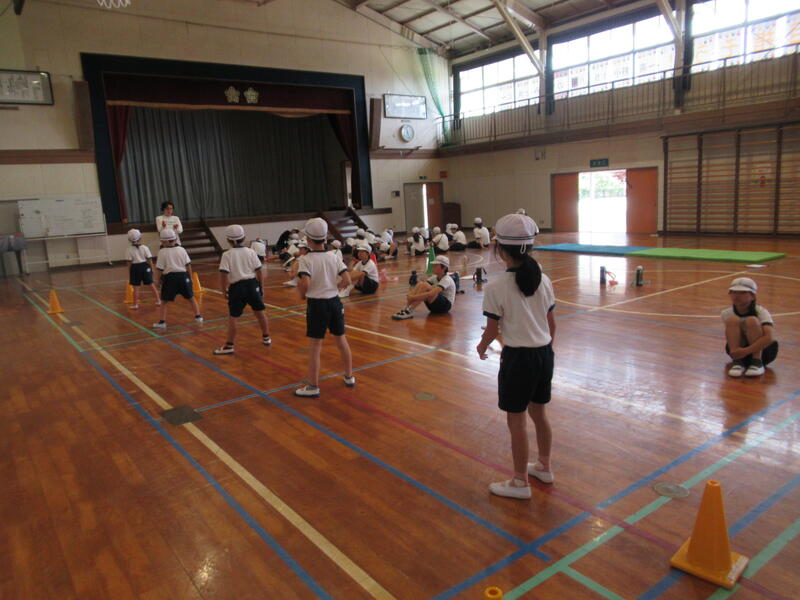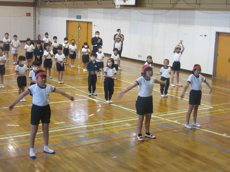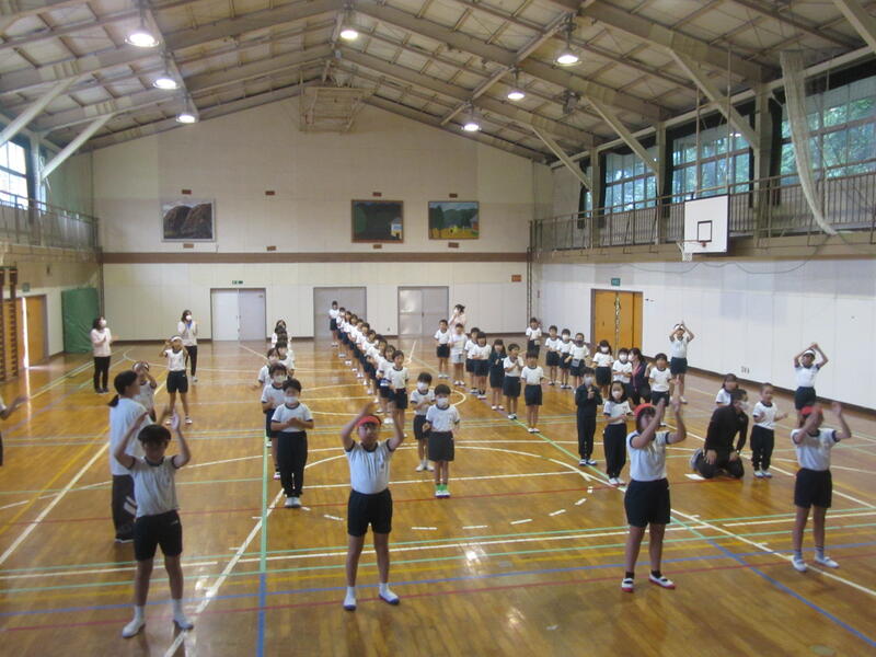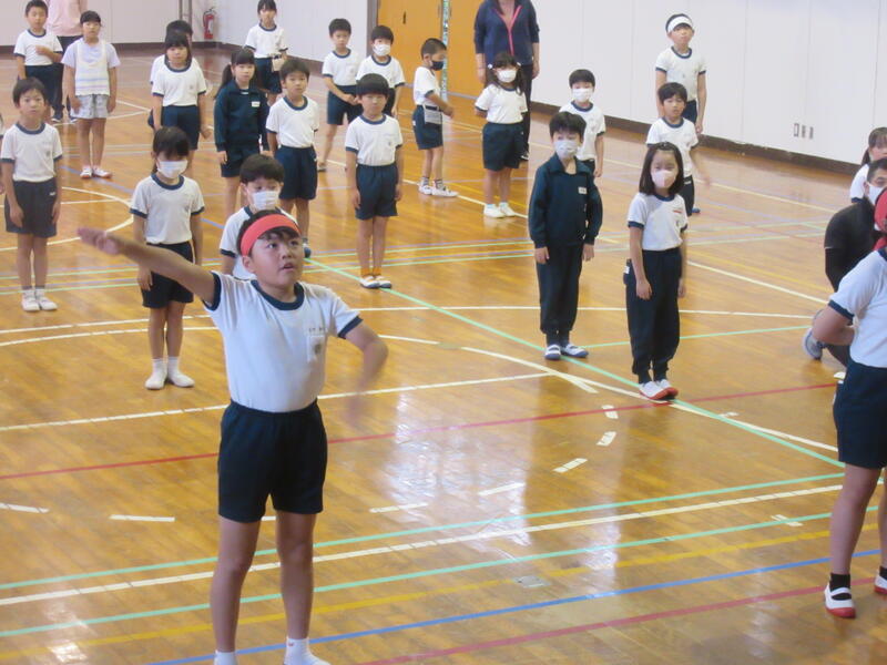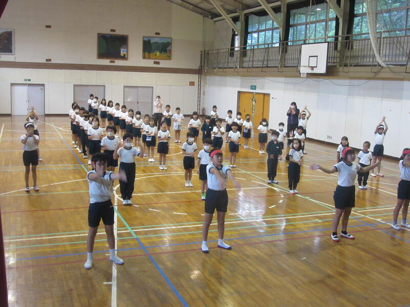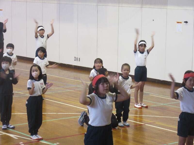 本日、大休憩に体育館から元気のいい声が聞こえてきました。体育館へ行ってみると1~5年生が集まっていました。