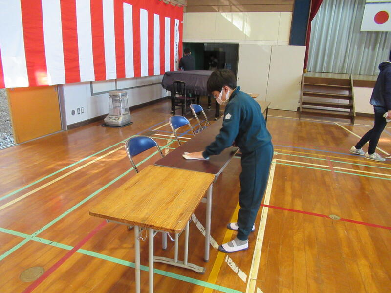 5年生は、モップを使って体育館をきれいにした後、椅子や机を丁寧に並べました。