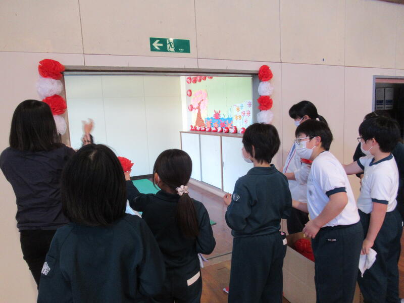 入場の入り口の扉の飾り付けも、先生方と一緒に行いました。