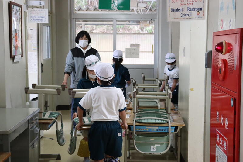 その後、1年生は、自分の机を廊下に運び出しました。