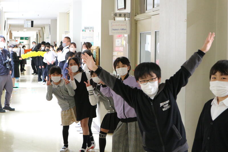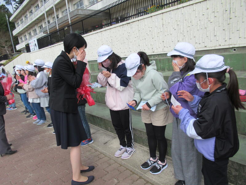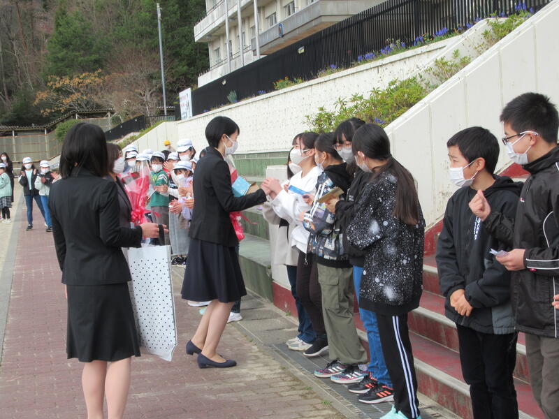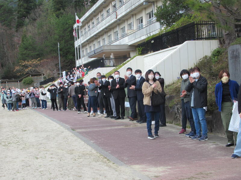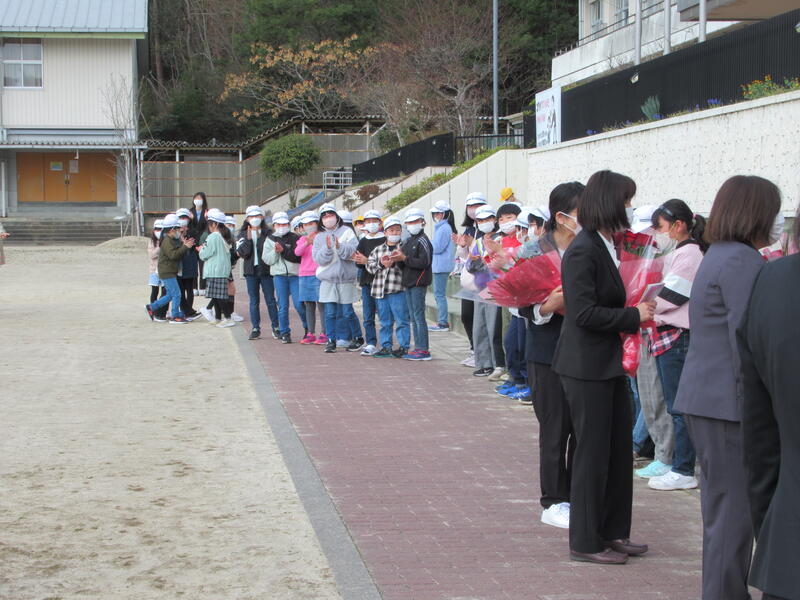 離任式の後、全校生でお見送りをしました。今回も中学生や、中学校の先生方が一緒に見送ってくださいました。