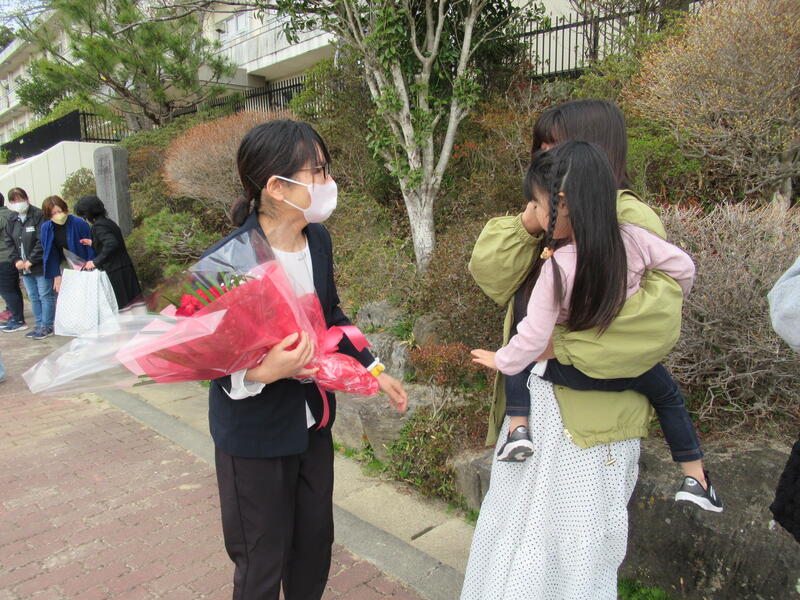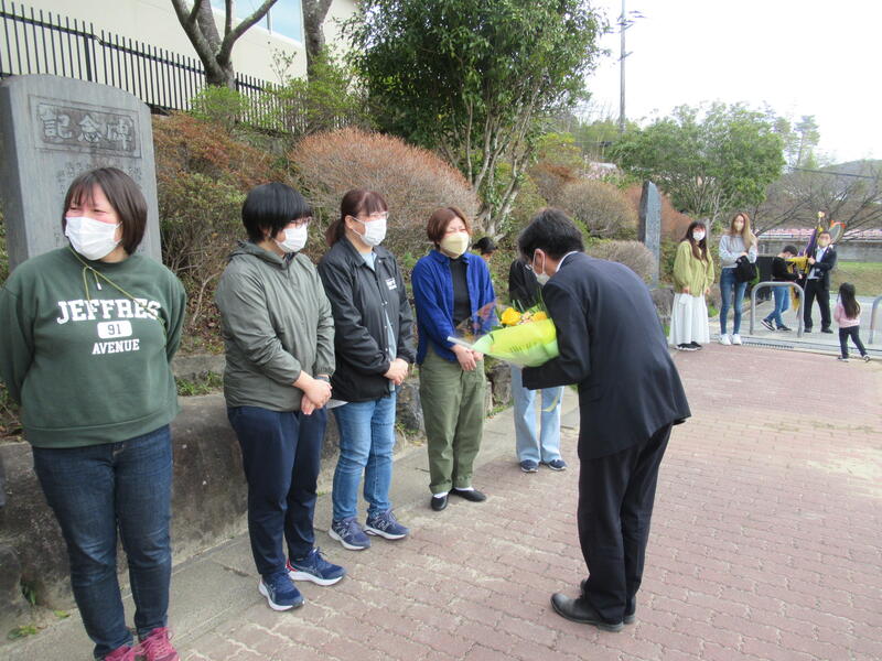 子供たちから花束を贈呈しました。涙があふれても、お世話になった先生へ一生懸命に感謝の言葉を伝えていました。