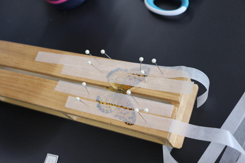 「標本作り」は、チョウの「むね」に針を刺して固定し、羽を90°にひろげます。