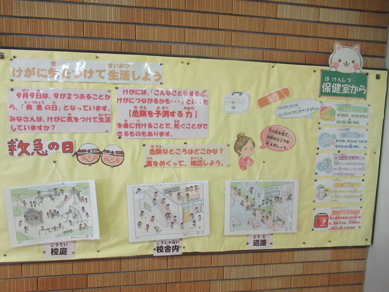 昇降口には、9月9日(救急の日)に合わせた掲示物があります。子供たちも興味をもって読んでいるようです。