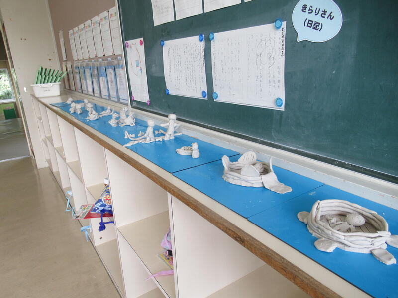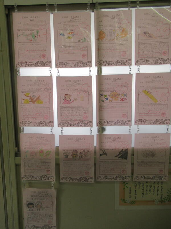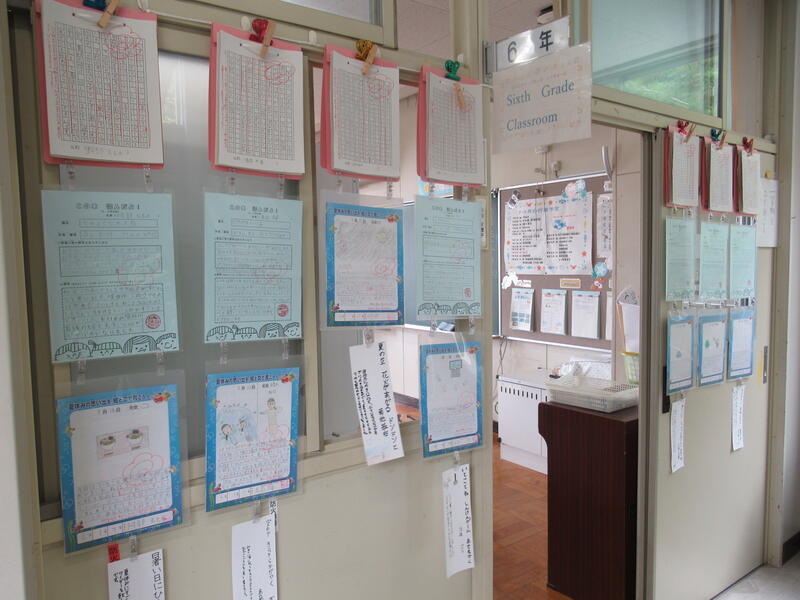 教室前廊下には、夏休みの宿題など、がんばったことや思い出などが掲示されています。