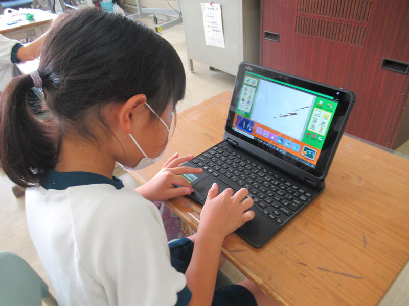 早く描き終わった児童は、タブレットのお絵かきソフトを使ってお絵かきをしています。
