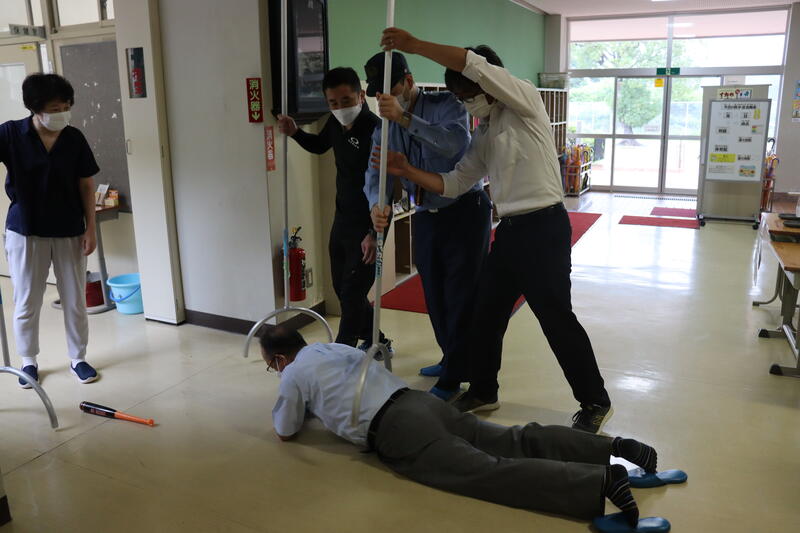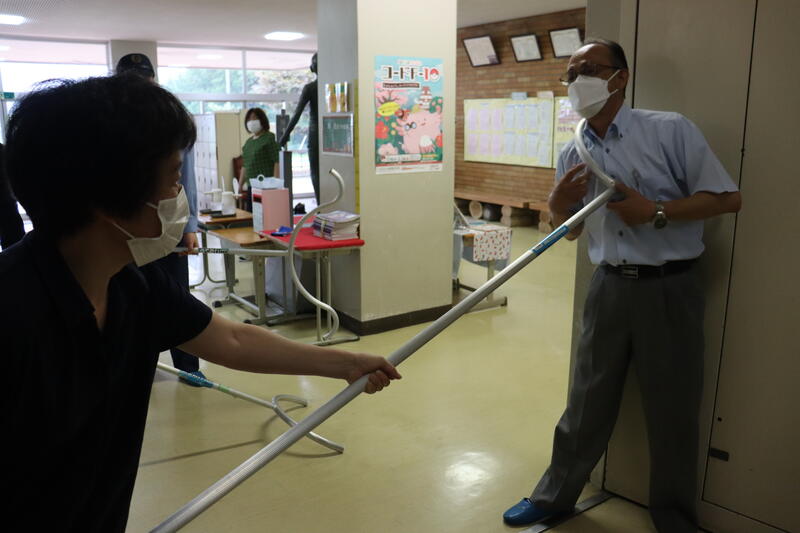 生活安全課スクールサポーターの方に不審者役をお願いし、さすまたを使った不審者への対応の仕方等を教わりました。