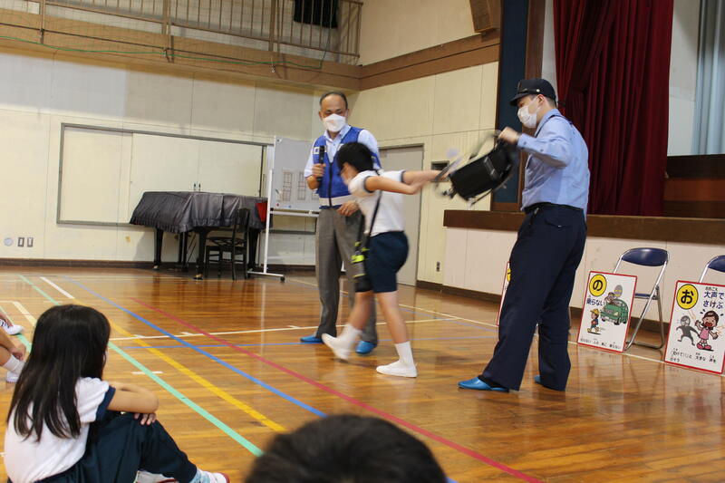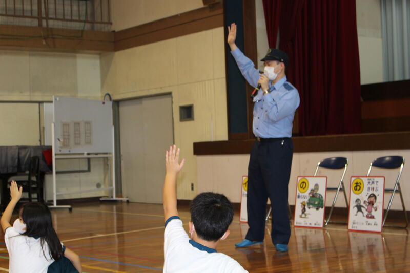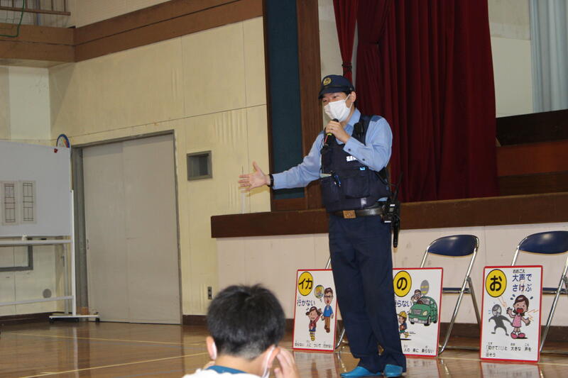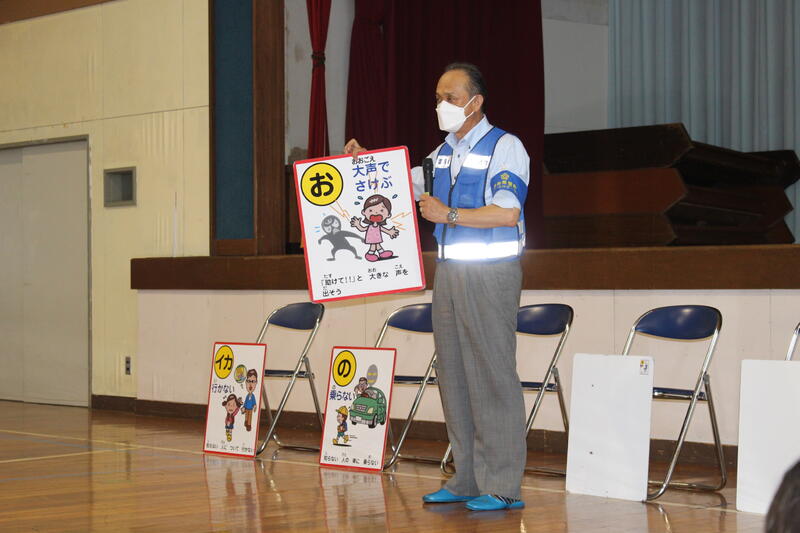 「イカノオスシ」について、スクールサポーターの藤家様より具体的に説明をしてもらいました。学校内にいる時に不審者に出会ったら、「オスシ」を、それ以外であれば「イカノオスシ」を心掛けましょう。
