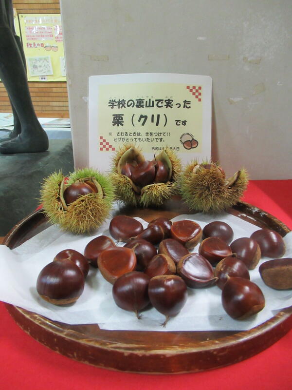 学校の裏で立派な栗を拾いました。昇降口に展示しています。