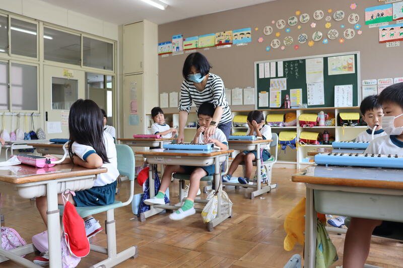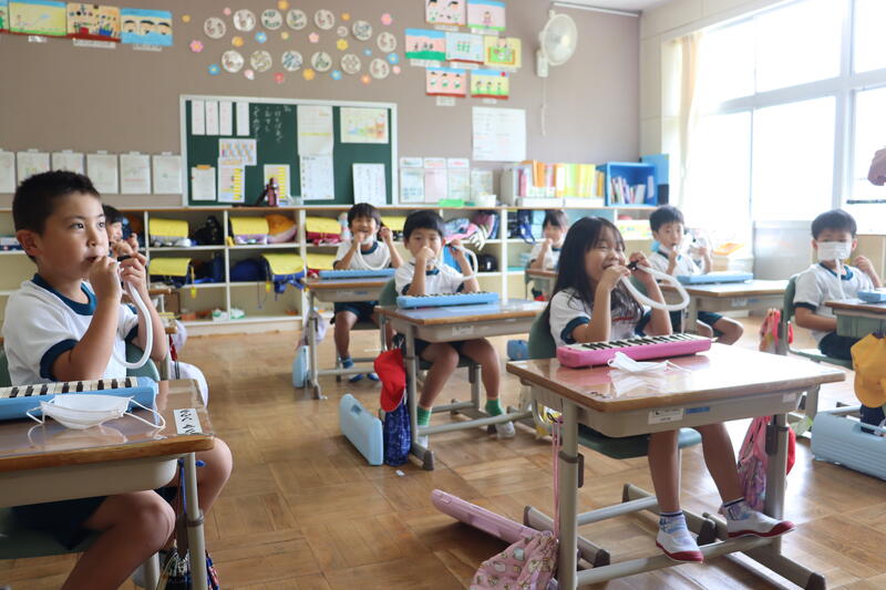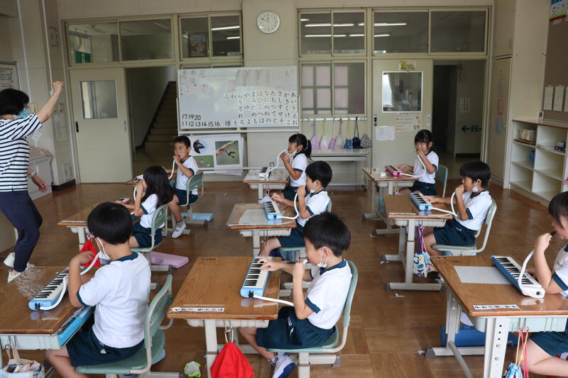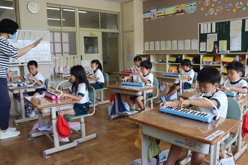 1年生が、音楽で初めて鍵盤ハーモニカを使った学習をしました。