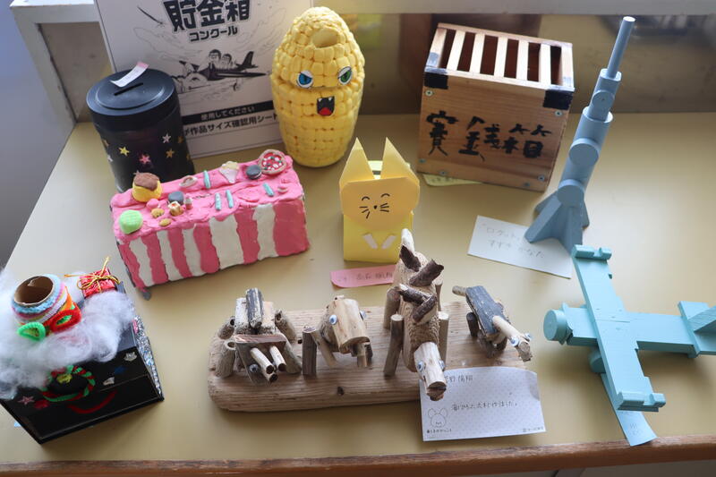 「木工工作」と「アイデア貯金箱」の作品です。どの作品も、アイデアいっぱいですてきですね。