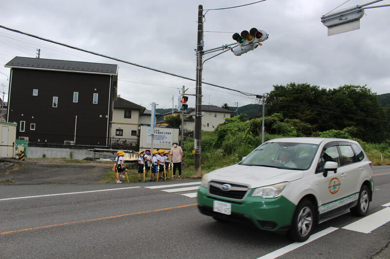 まずは、学校の近くにある横断歩道をみんなで渡ってみました。横断歩道を渡るときにも、しっかり左右確認をしてから、手を挙げて渡ります。