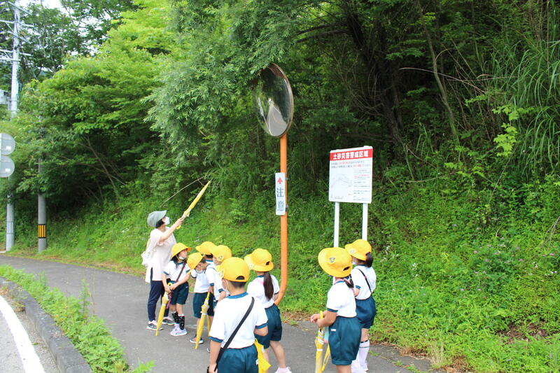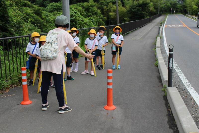みんなで通学路を歩き、横断歩道や車止めのポールなど安全に歩くことができる道路のしくみを覚えて、安全な歩き方について学習しました。