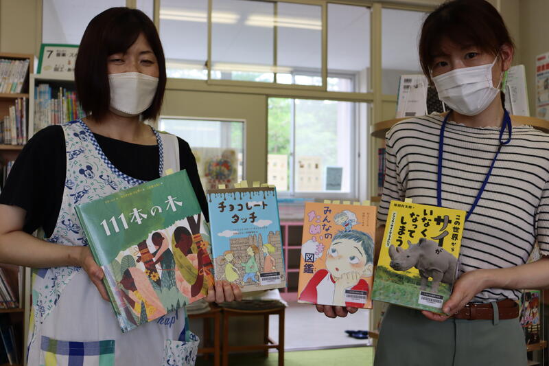 (中学年の課題図書4冊を手に、学校司書(左)と読書サポートティーチャー(右)のお二人)