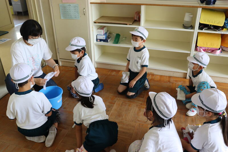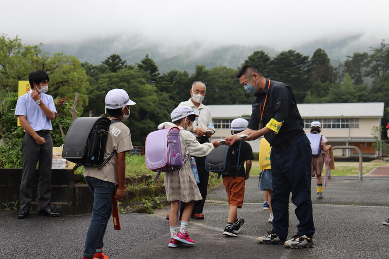 防犯意識が高まるようにと、子供たち一人ひとりに「イカのおすし」の説明のイラストが書かれたティッシュを配ってくださいました。
