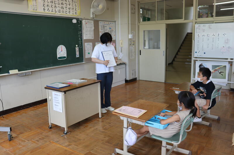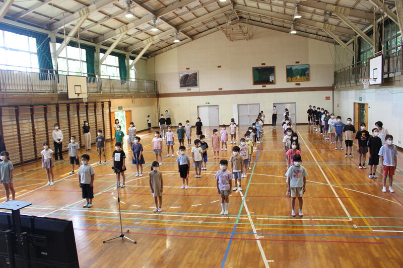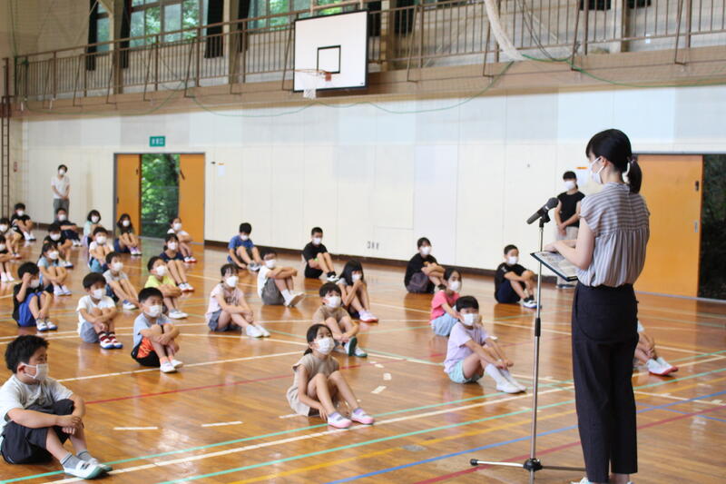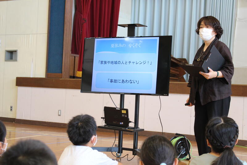 校長先生からは、1学期の学校全体や各学年での頑張りの振り返りや、夏休みの過ごし方についてのお話がありました。「夏休みに何か一つチャレンジして、家族との思い出に残る夏休みにしてください。事故にあわないように過ごしましょう。2学期、元気な皆さんに会えることを楽しみにしています。」