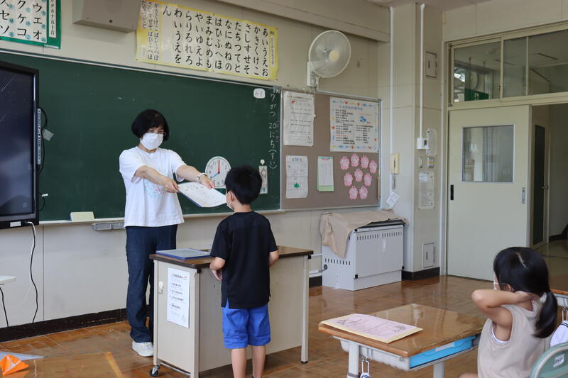 はじめての通知表をもらう一年生。1学期本当によく頑張りました。