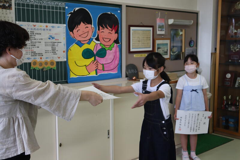「特選」を受賞した代表児童へ賞状を授与しました。
