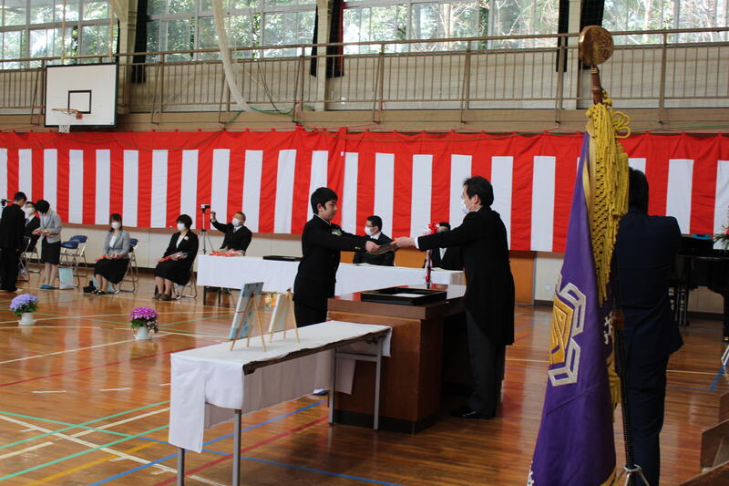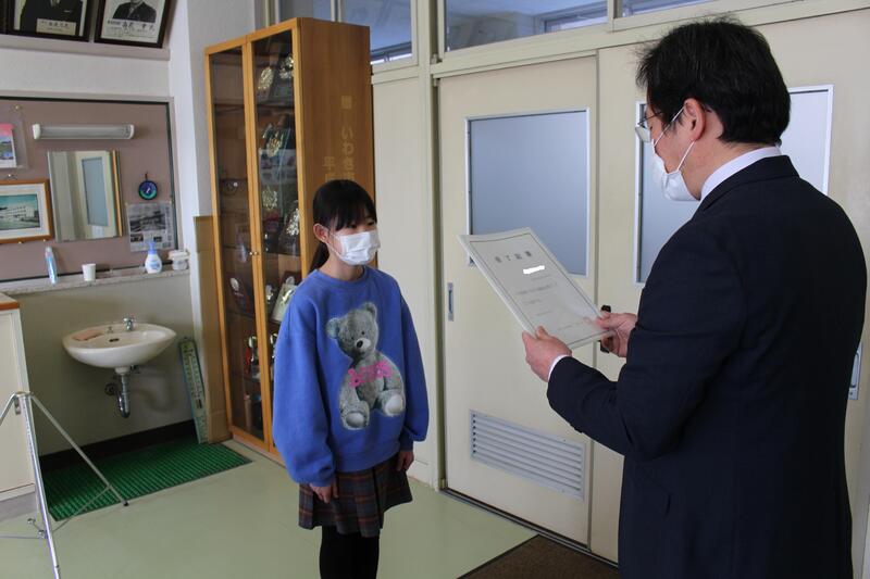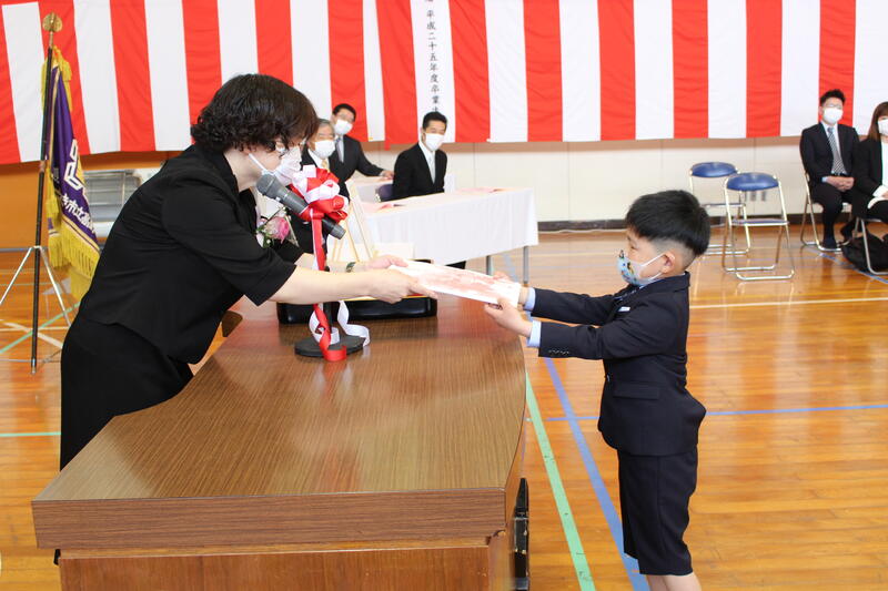 <修了証書授与> 校長先生から、5年生代表児童に修了証書を手渡しました。