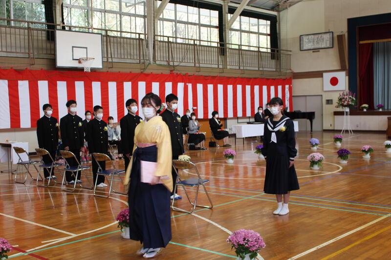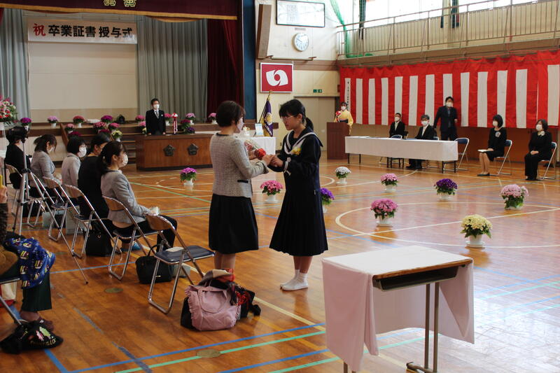 卒業証書をいただいた後、卒業生から保護者の方へ、感謝の気持ちを込めて花束を贈りました。