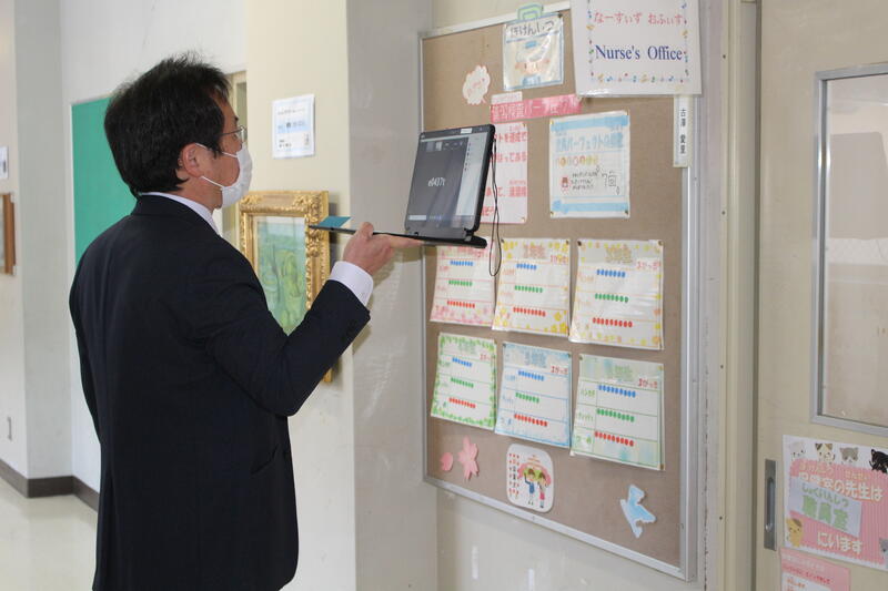<校長先生のお話> 校長先生がタブレットを持って、校舎内を撮影しながらお話ししました。この1年間で子供たちができるようになったこと、成長したことについて、校舎内の掲示物や各学級をまわってお話しました。