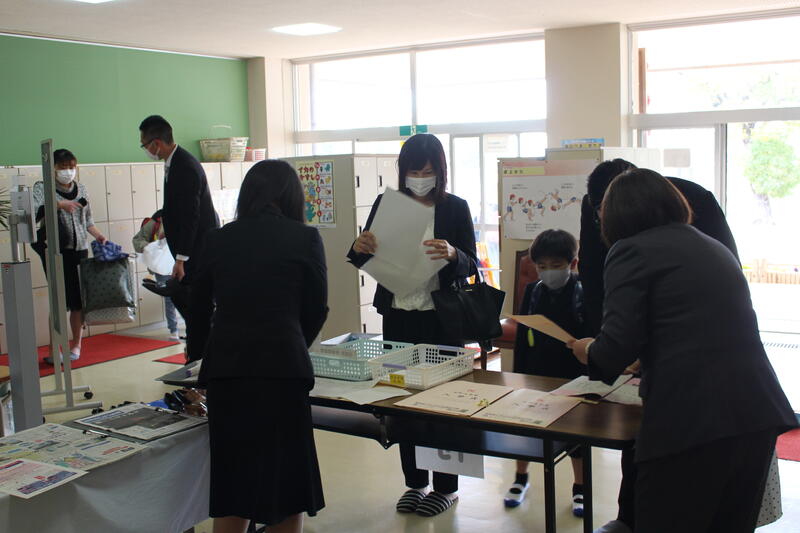 <受付>お家の方と一緒に受付をしました。入学式に向けて、ちょっと緊張気味の新入生。