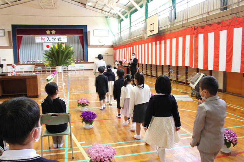 <入場>入学式が始まりました。担任の先生に続いて、しっかりと入場できました。