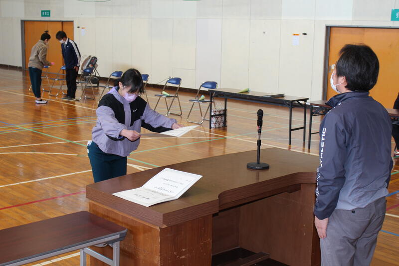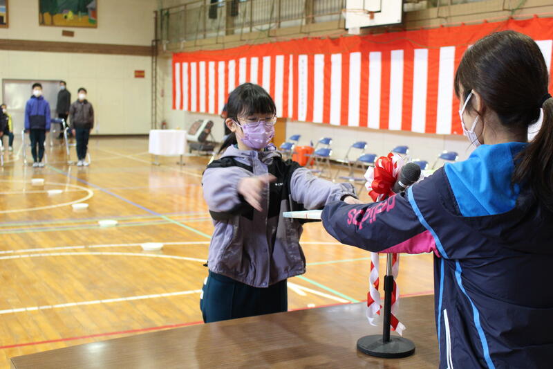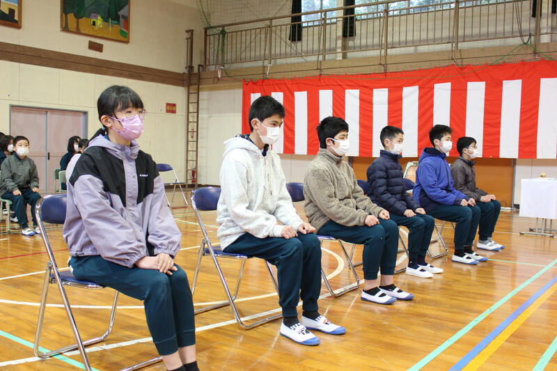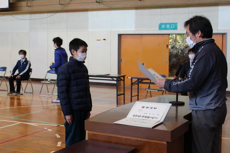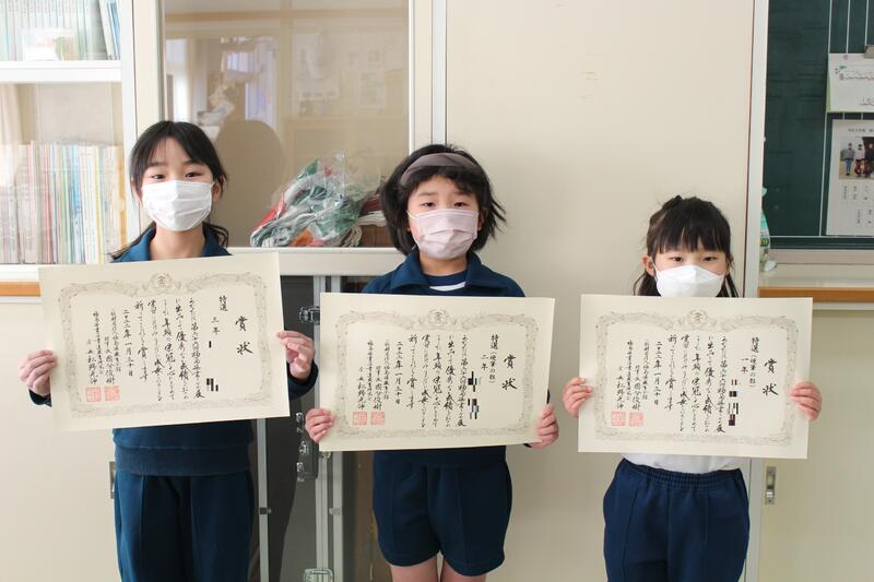 まずはじめに、福島県書き初め展において優秀な成績をおさめた高野っ子の表彰です。多くの高野っ子が表彰となったため、今回は代表で3名が表彰を受けました。頑張った皆さん、おめでとうございます