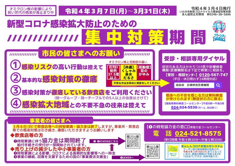 本市における「まん延防止等重点措置」は、昨日をもって解除されましたが、本市においては「いわき市新型コロナウイルス感染拡大防止のための集中対策期間」を設け、感染拡大防止のために取り組むこととなりました。