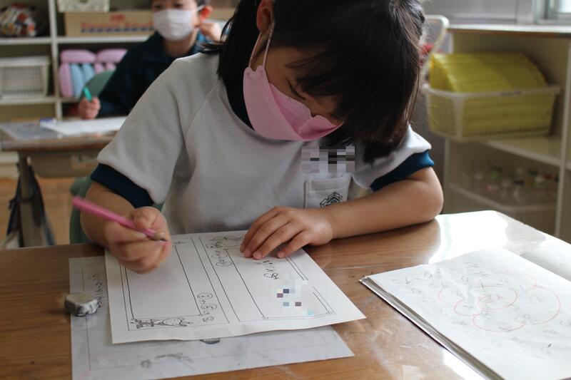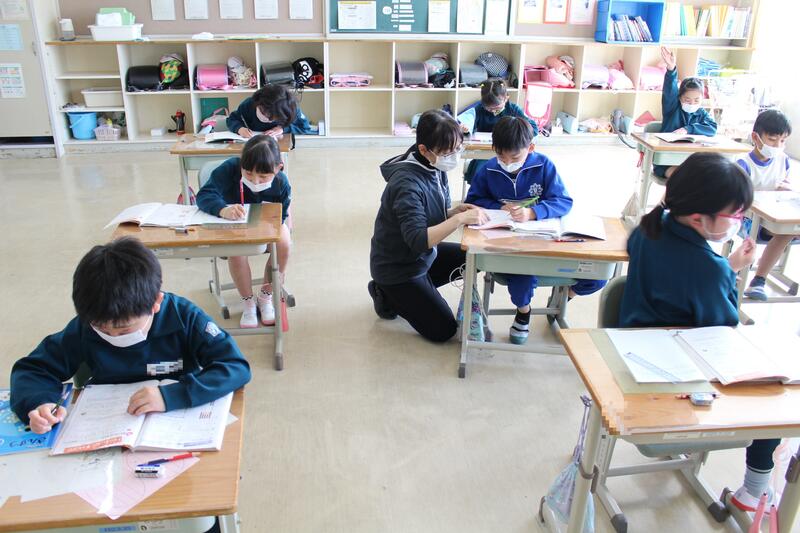 1年生の教室。国語科の学習で、自分の名前を書いていました。年度当初に比べると、格段に上達しています。自分の成長を感じながら、よりきれいに書こうと努めていました。