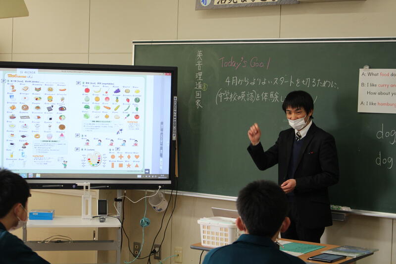 6年生の教室。内郷第三中学校英語科の先生との学習「英語科Flying start」。中学校での英語科の学習をちょっと早めに体験しました。これまでの積み重ねもあり、英単語の読み書きもスラスラできており、英語の先生からお褒めの言葉を頂いていました。
