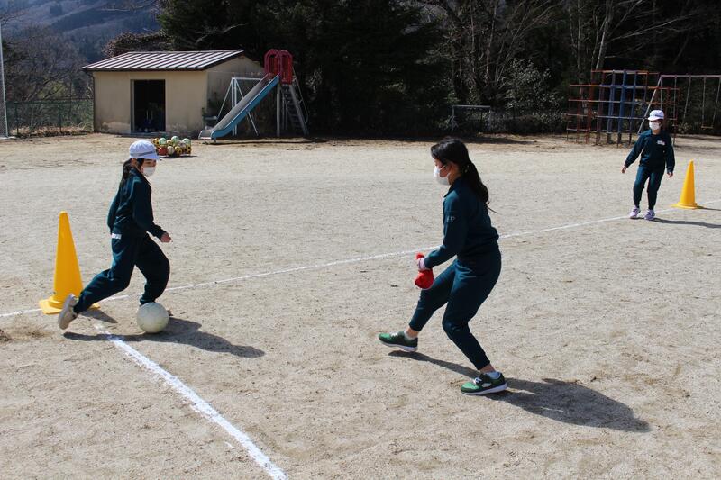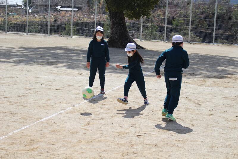 3・4年生は校庭に。体育科の学習でミニサッカーです。パスも上達してきたので、少しレベルアップ。パス回しの練習です。素早く正確なパスって、なかなか難しいなあ。