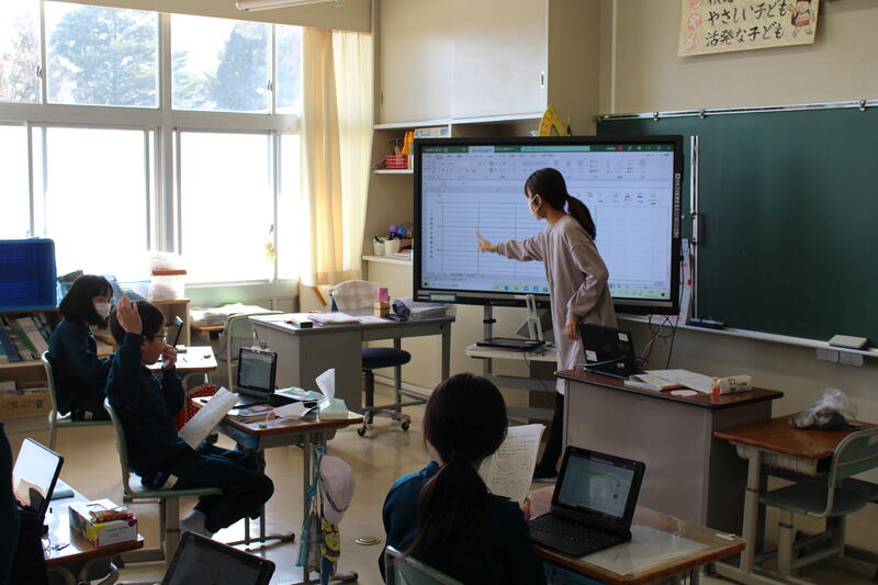 5年生の教室。理科の実験の結果をExcelを使ってグラフ化に挑戦。ICTサポーターの先生にも教えていただきながら、頑張っていました。