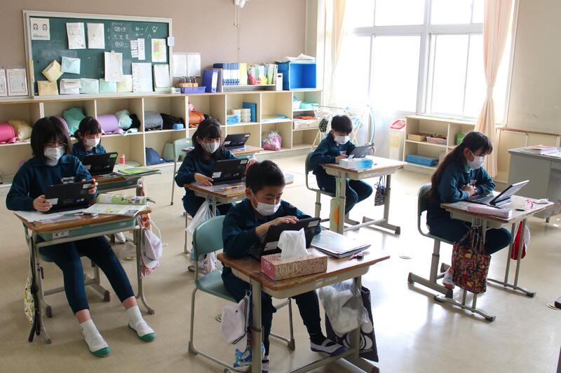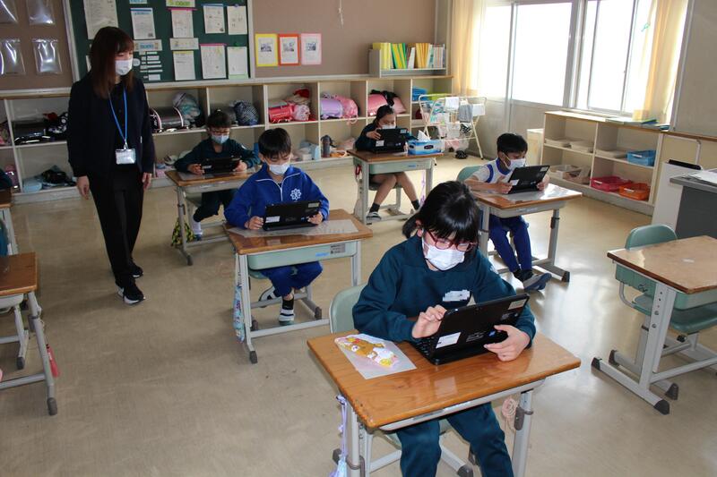 2年生の教室。タブレット型PCを使って、計算力アップに取り組んでいました。